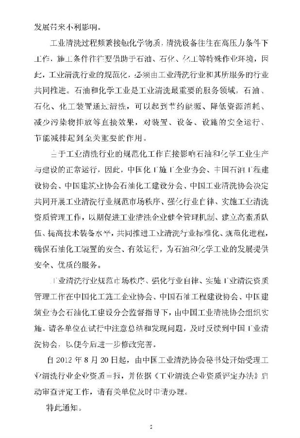 工業(yè)清洗行業(yè)規(guī)范市場秩序、強化行業(yè)自律、實施工業(yè)清洗資質(zhì)管理工作在中國化工施工企業(yè)協(xié)會、中國石油工程建設(shè)協(xié)會、中國建筑業(yè)協(xié)會石油化工建設(shè)分會監(jiān)督指導(dǎo)下,由中國工業(yè)清洗協(xié)會組織實施。請各單位在試行中注意總結(jié)和發(fā)現(xiàn)問題,及時反饋到中國工業(yè)清洗協(xié)會,以便今后進一步修改完善。