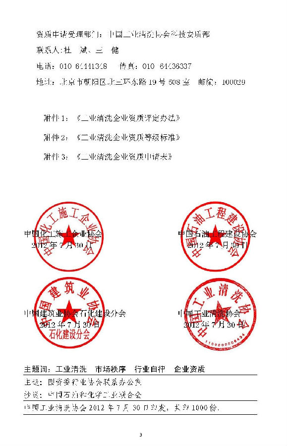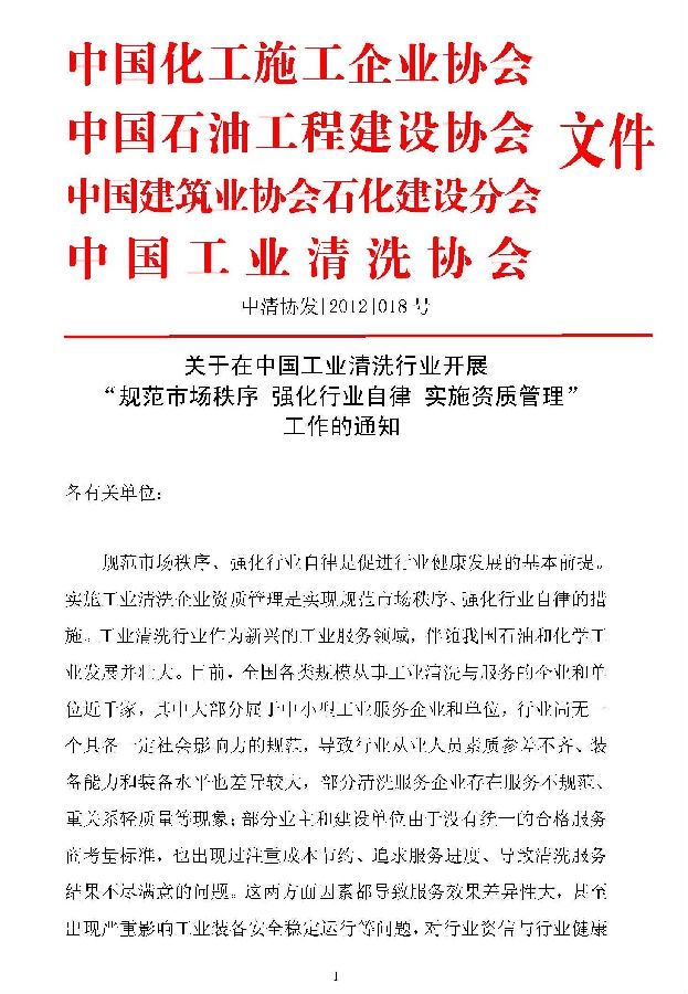 ? ?工業(yè)清洗行業(yè)規(guī)范市場 秩序、強(qiáng)化行業(yè)自律、實施工業(yè)清洗資質(zhì)管理工作在中國化工施工企業(yè)協(xié)會、中國石油工程建設(shè)協(xié)會、中國建筑業(yè)協(xié)會石油化工建設(shè)分會監(jiān)督指導(dǎo)下,由中國工業(yè)清洗協(xié)會組織實施。請各單位在試行中注意總結(jié)和發(fā)現(xiàn)問題,及時反饋到中國工業(yè)清洗協(xié)會,以便今后進(jìn)一步修改完善。